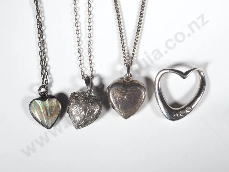 Two Sterling Silver Lockets, A Paua Shell & Silver Heart Shaped Pendant & a Sterling Silver Heart Shaped Modernist Penda Estimate: $50 - $100