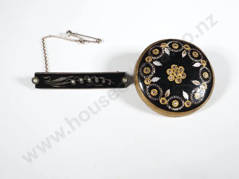 Black Enamel & Seed Pearl Bar Brooch & A Circular Enamel Brooch w Gold & Silver Decoration Estimate: $40 - $80