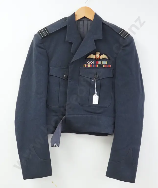 Post WWII RNZAF Khaki Bush Jacket w Kings Crown Buttons & Pilots Brevet Medal Ribbons.