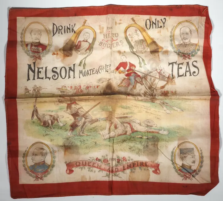 Handkerchief Advertising Hero Bugler's 'Drink Only Nelson Moate & Co's Ltd Teas'.