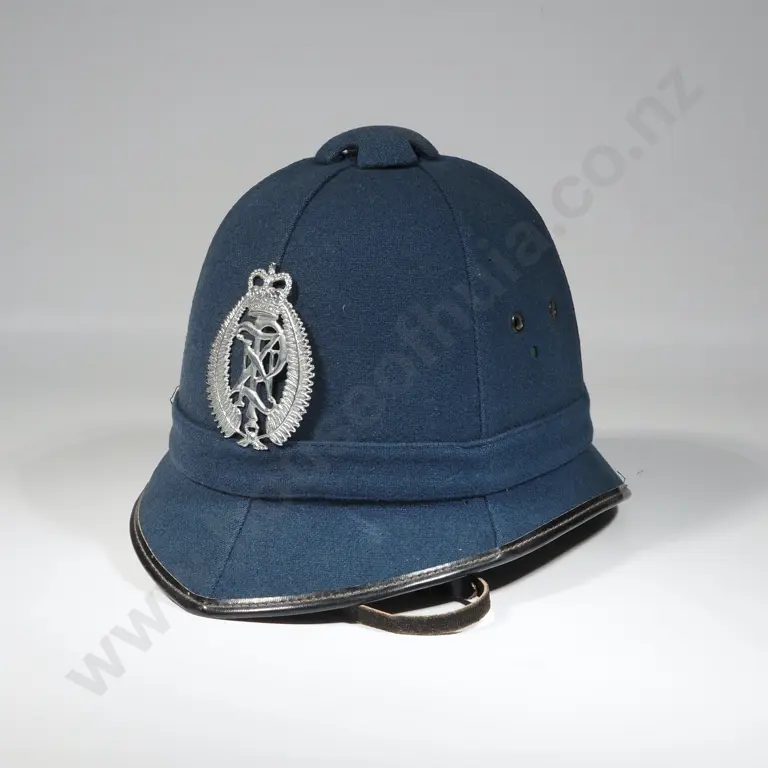 Blue New Zealand Police Helmet w Queens Crown Helmet Plate - One Moth hole