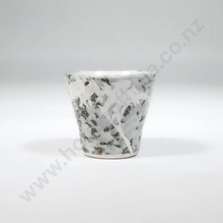 Porcelain Karatsu Guinomi Sake Cup with Heavy Mottled Green & White Glaze. Marked With Japanese Characters To Base