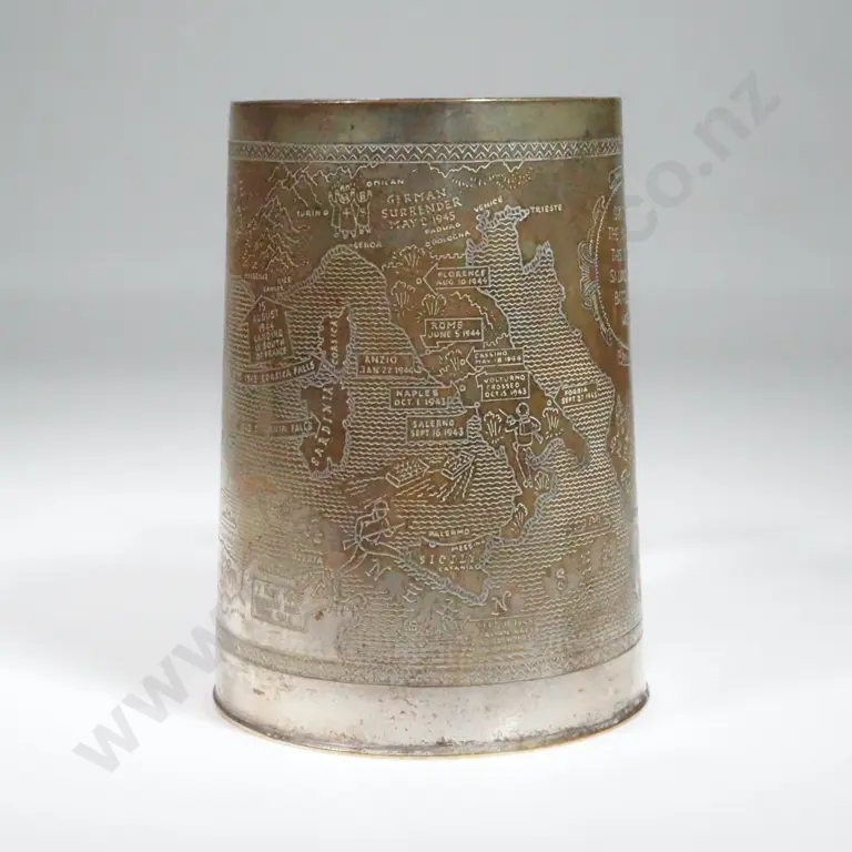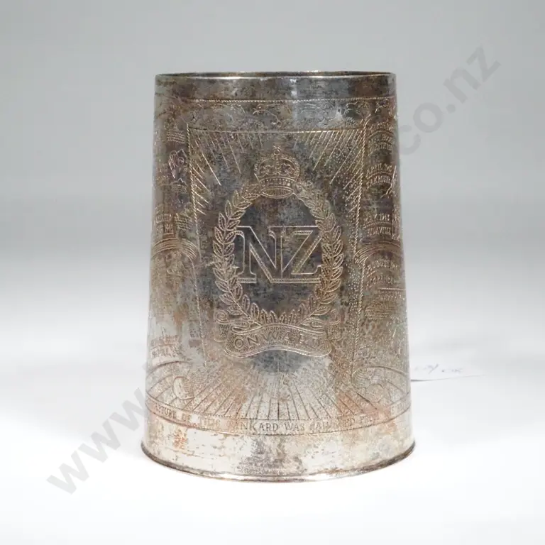 NZ Onward Silvered Brass Tankard Engraved w Mediterranean Regional Map.