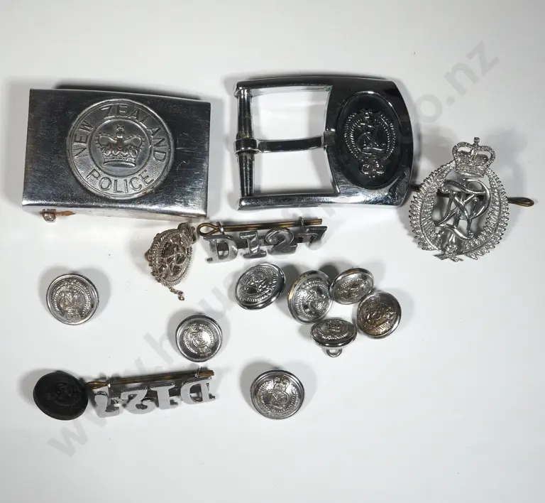 Two NZ Police Belt Buckles, One Cap Badge, ID Numbers & Buttons.