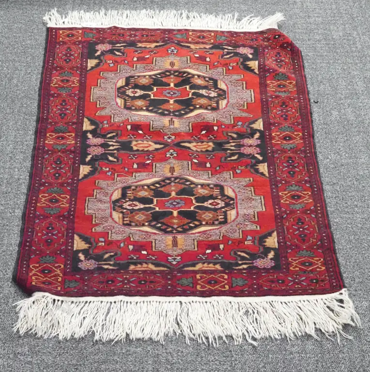 Hand Knotted Afghan Rug. Red Ground With Two Large Geometric Patterns to Centre