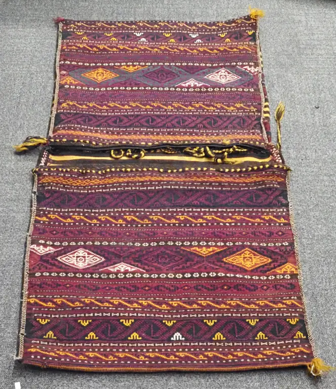 Afghan Kilim Double Camel/ Saddle Bag. Crimson Ground With Allover Geometric Patterns.