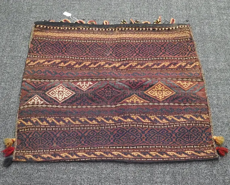 Kilim Single Camel/Saddle Bag In Mauves, Blue & Browns With Allover Geometric Decoration