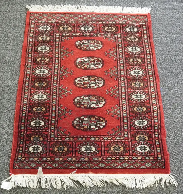 Small Hand Knotted Pakistani Wool Fine Tikka Design Rug - Red w Cream/Grey Motif.