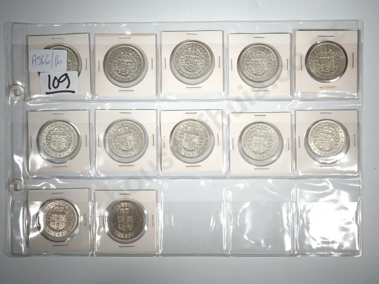 13 New Zealand Florin's: 1x 1933, 1x 1937. 1x 1940, 1x 1941, 1x 1943, 1x 1944, 2x 1945, 5x 1946,