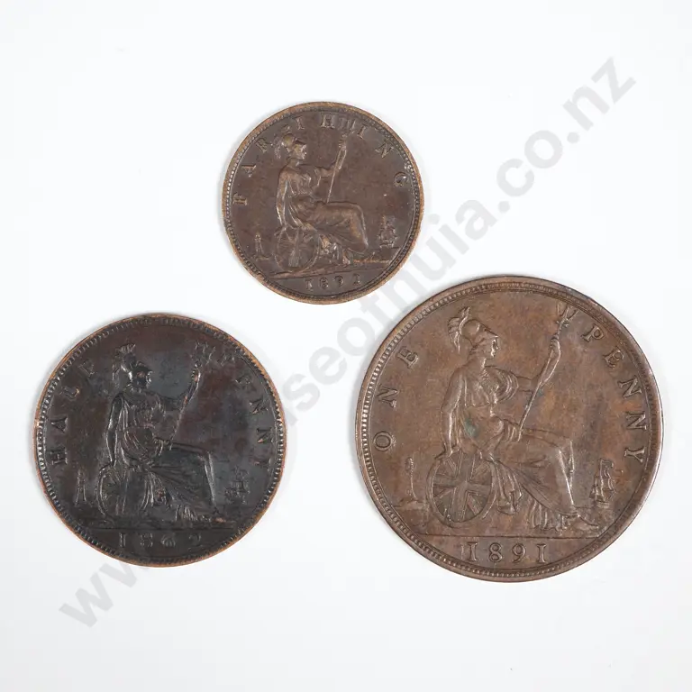 1862-1892 Great Britain Farthing, Half Penny & Penny - 1892 Farthing (Scarce), 1862 Half Penny (Quite Nice) & 1891 Penny