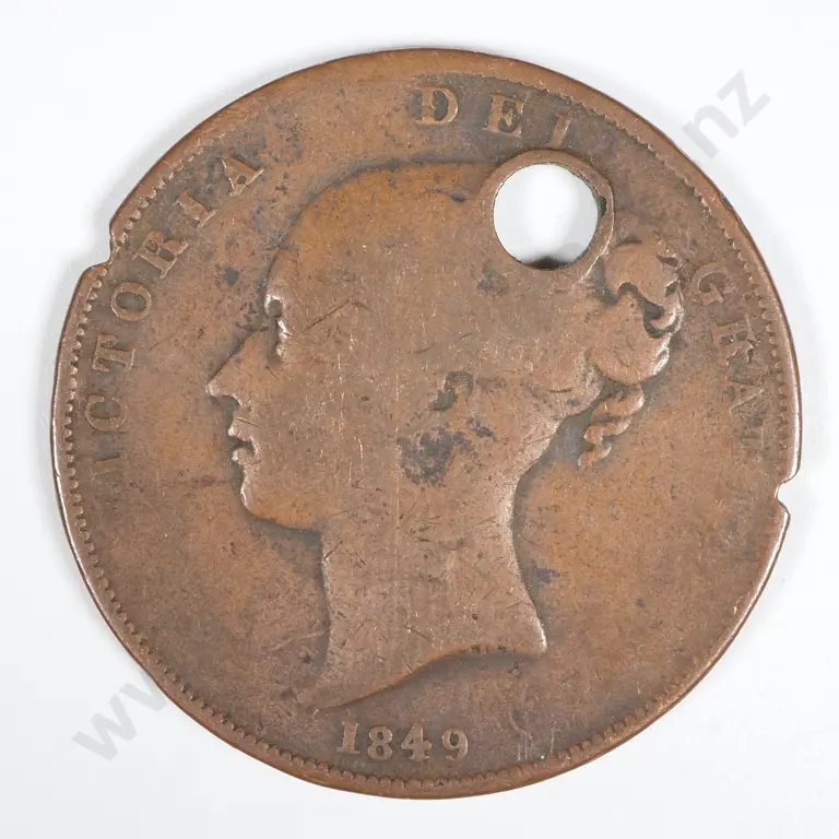 1849 Great Britain Penny - Very Rare Date. Holed & Several Edge Fillings. A Space Filler But Very Rare.