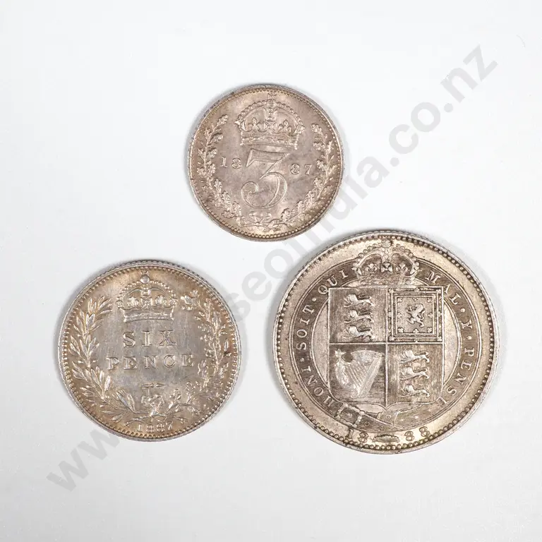 1887 Great Britain Threepence, Sixpence & Shilling. All Jubilee Heads. Silver. Nice Group