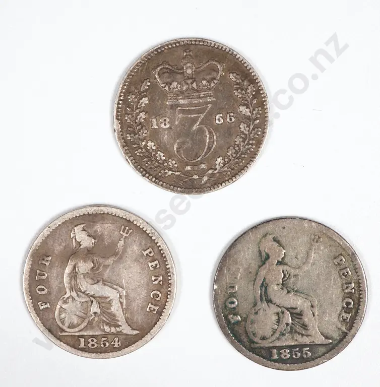 3 x 1850s Great Britain Silver Coins. 1856 (Slight Bend), 1854 Groat (Four Pence) 1855 Groat (Fourpence).