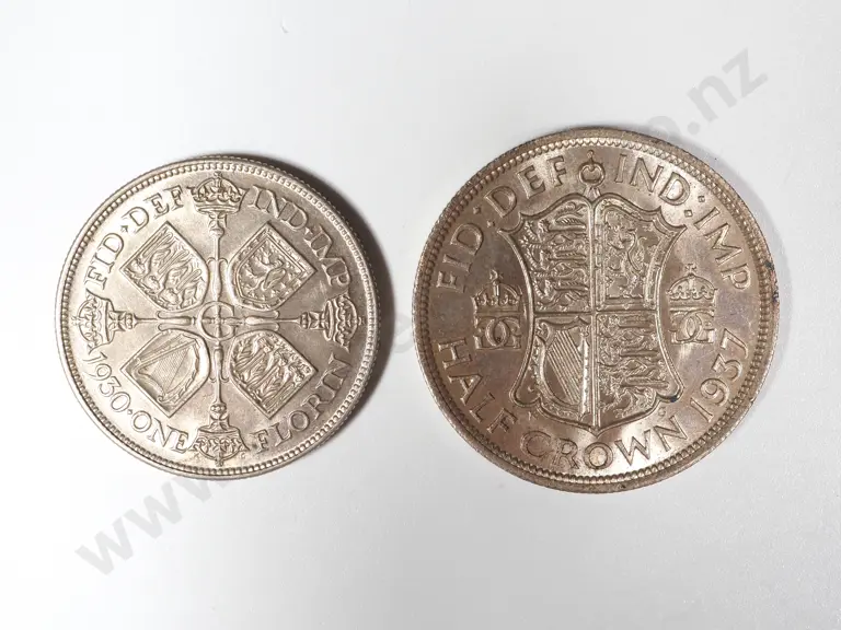 1930 Florin & 1937 Half Crown Great Britain. Nice. Two Lustrous Examples. Both .5 silver. Half Crown has a Little Mark