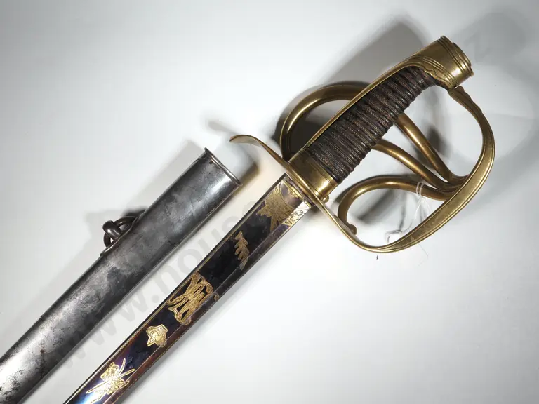 Brass Hilted Cavalry Sword Part Blued Blade w Metal Scabbard. Possibly French.
