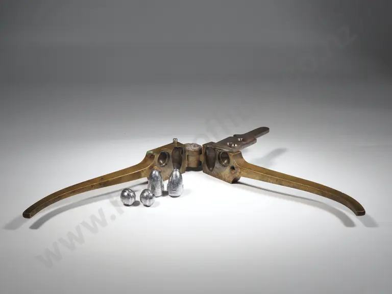 Rare Original Brunswick Two Cavity Brass Bullet Mould for Belted Ball & Conical Bullet w Wings, .650 Calibre Circa 1820 Estimate: $400 - $600