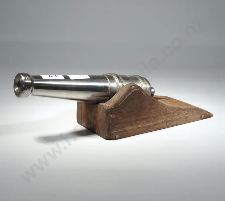 Decorative Heavy Stainless Steel Naval Cannon on Wooden Base. Estimate: $150 - $300