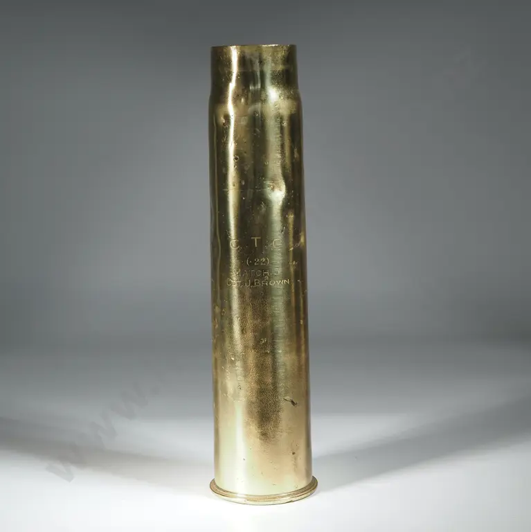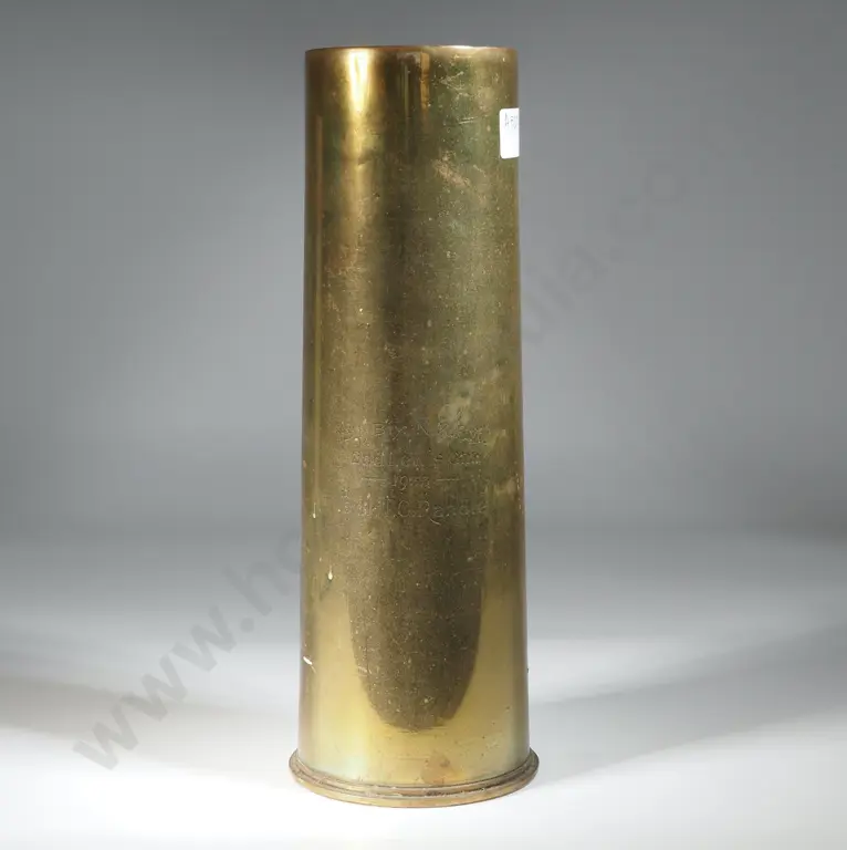 Trophy 18 Pounder Cartridge inscribed 12th Battery NZFA 2nd Lewis Gunner 1933