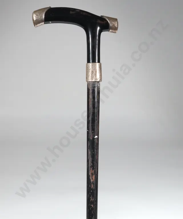 Vintage Walking Cane w Stirling Silver Band & Handle Ends.