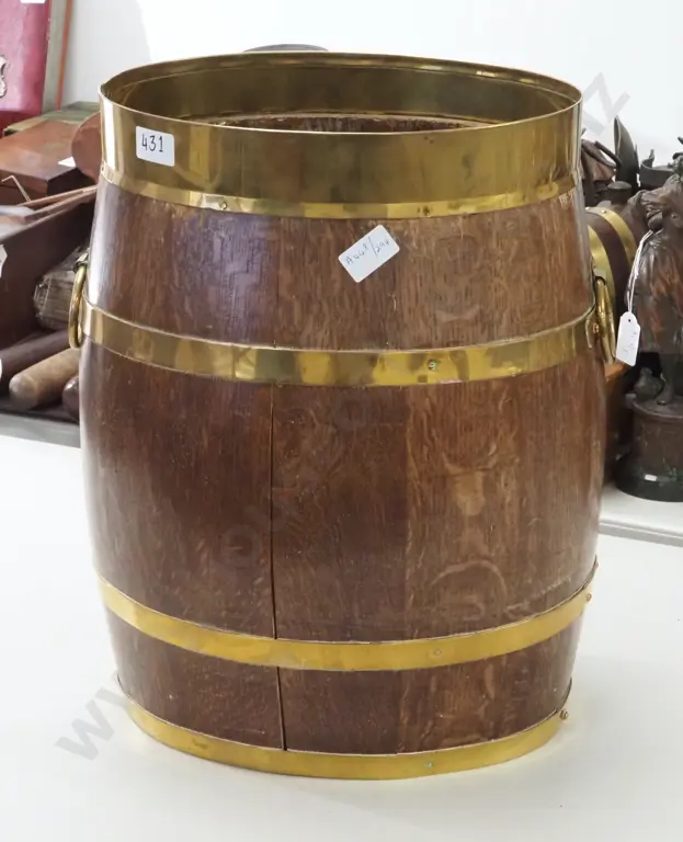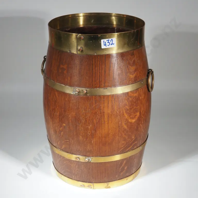 Vintage Oval Oak Brass Bound Coopered Barrel/Stick Stand w Brass Ring Handles Estimate: $100 - $200