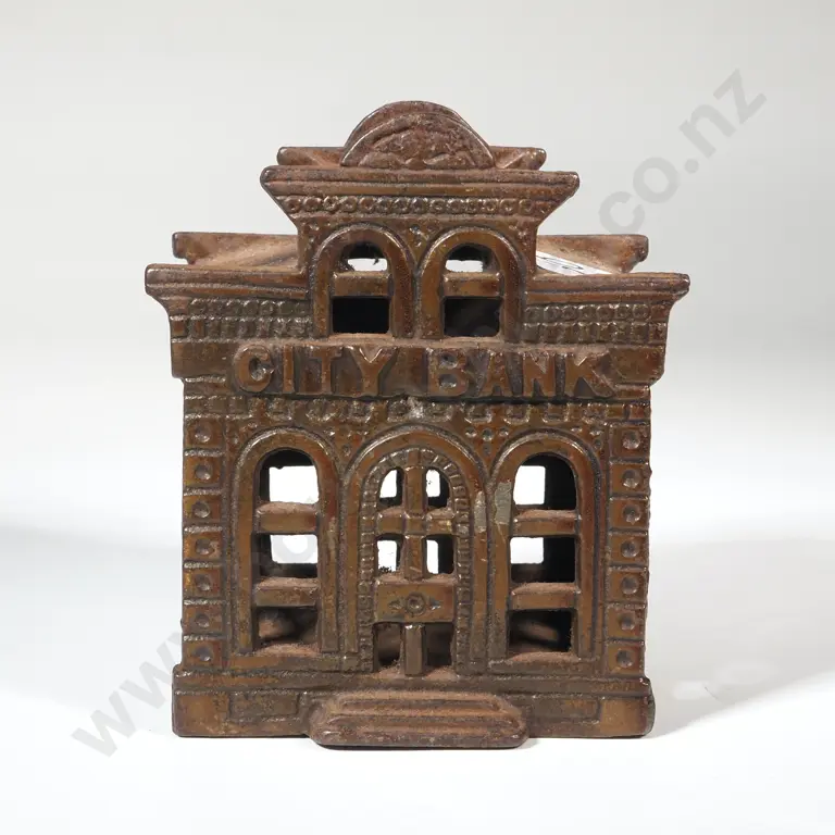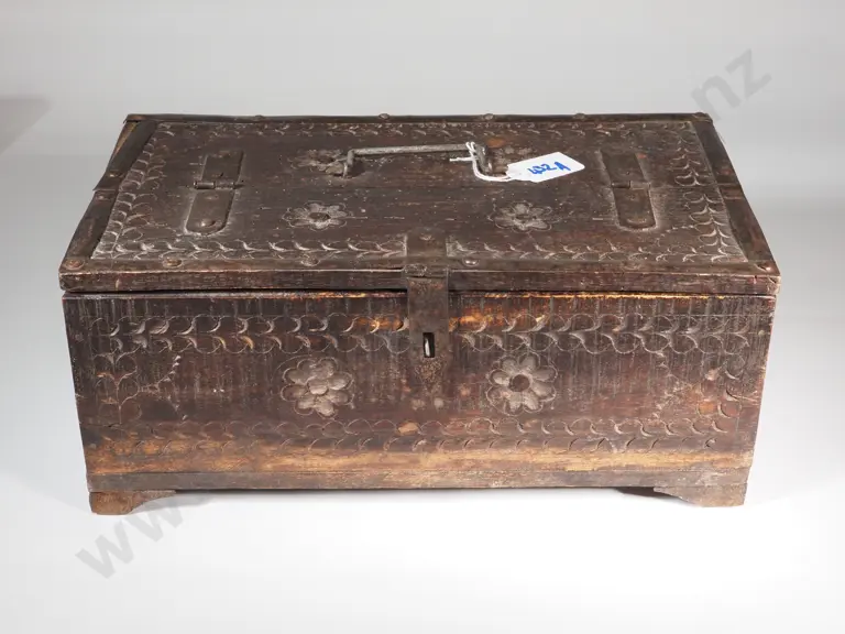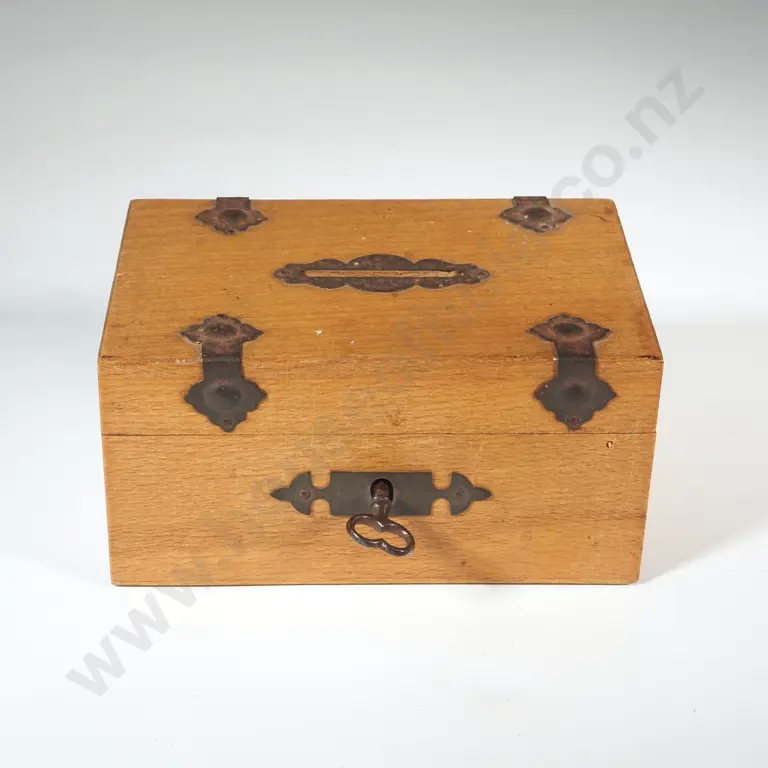 Timber Money Box with Key & Decorative Brass Straps & Escutcheons.