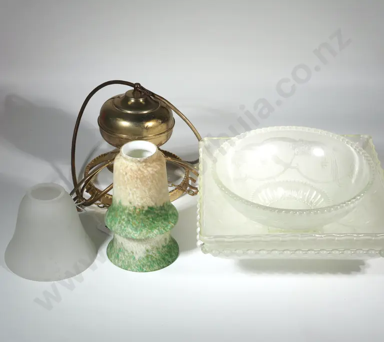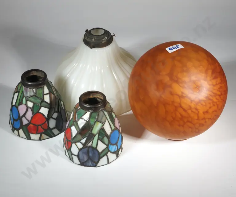 Four Vintage Lamp Shades - Two Stained Glass Shades, Pink Glass Shade, Large Milk Glass Glass Shade