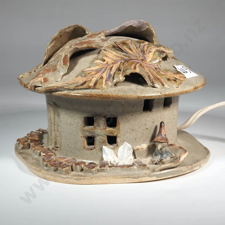 Pottery Table Lamp - Toadstool House w Leaf Litter on Top, Elf & Other Decorative Items at the base.