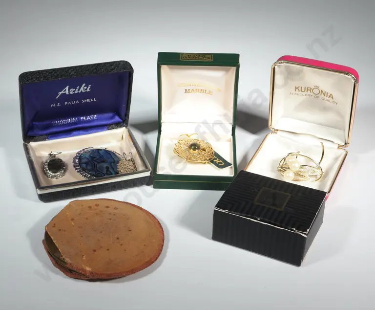Vintage Compact, Celtic Gold Plated Celtic Brooch, Paua Shell Brooch & Earrings,Pearl & Filigree Brooch & An Avon Brooch