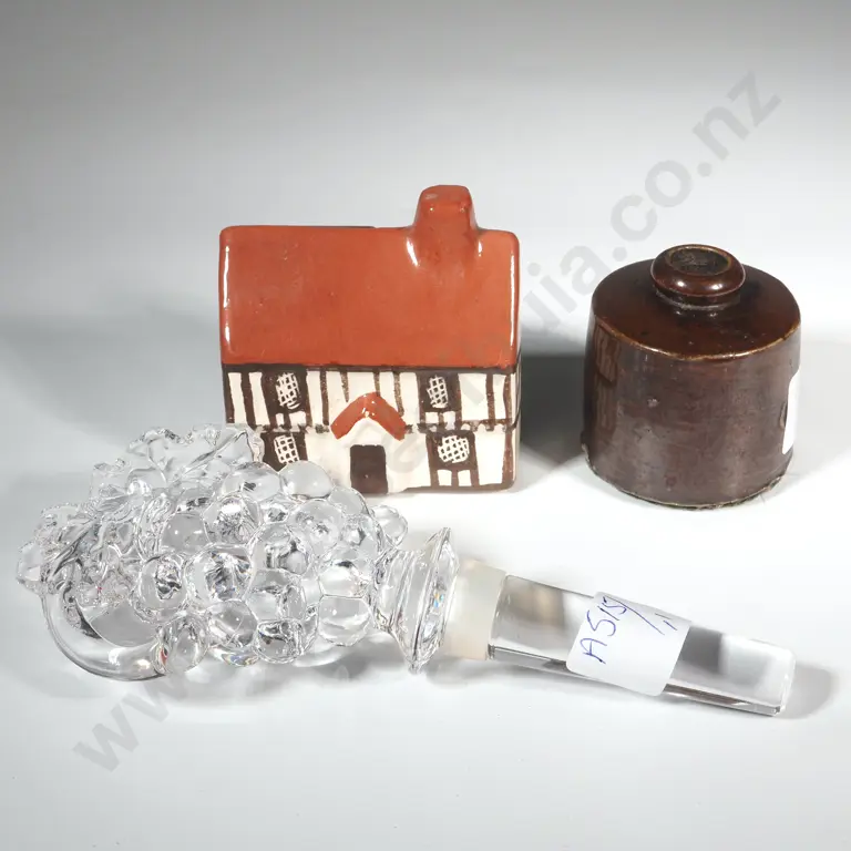 Antique Salt-Glazed Soneware Ink Bottle (Mid 1800s): Mulden End Studio-Felsham Miniature Ceramic Cottage; Glass Stopper.