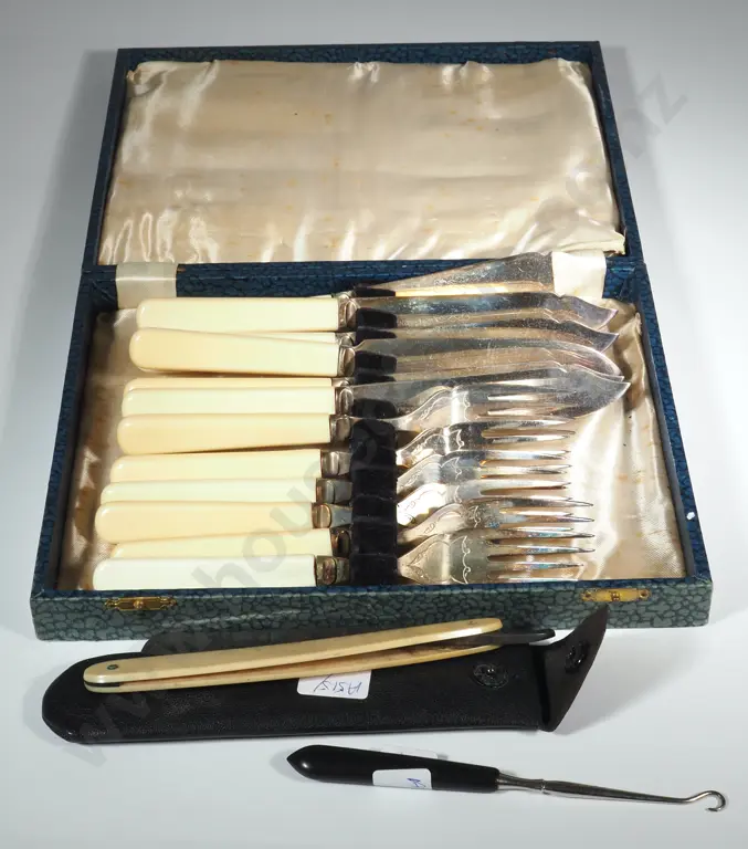 Bengald Ivory Strop Razor; Set of S/P Fish Cutlery; Chrome Bakelite Boot Hook