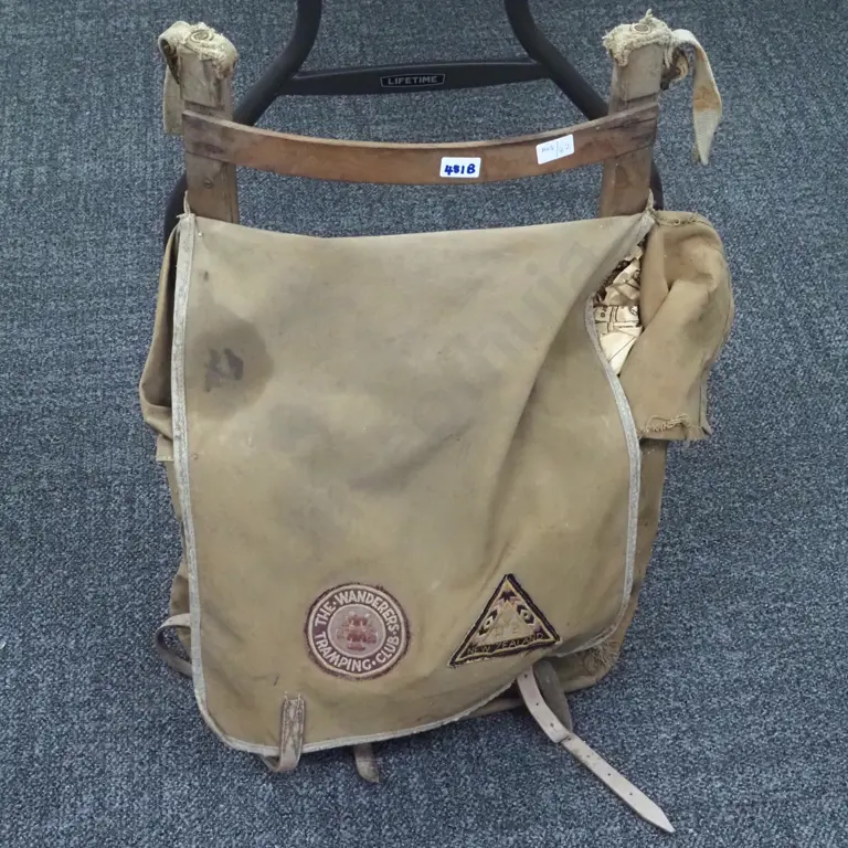Vintage Wood Framed Canvas Back Pack Featuring Patches From " The Wanderers Tramping Club & Youth Hostel Association NZ