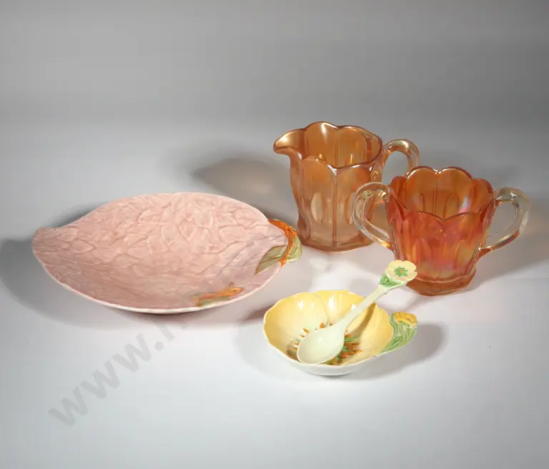 Carnival Glass Creamer & Sugar Basin, Carlton Ware Buttercup Jam Dish & Spoon & A Royal Venton Pink Leaf Dish