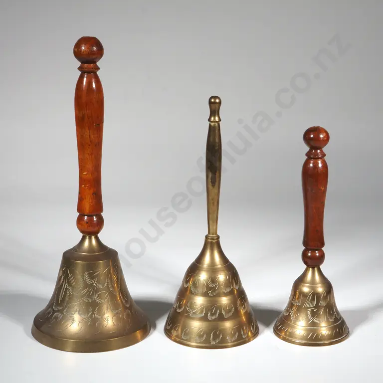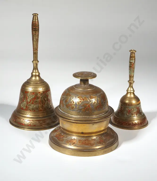 Vintage Indian Benares Brass Claw Bell & Two Other Benares Tables Brass Bells