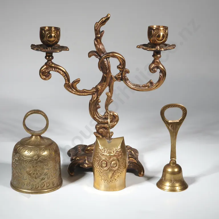 Ornate Brass Candelabra, Brass Temple Bell, Figural Owl Bell & A Table Bell with A Bottle Opener Handle