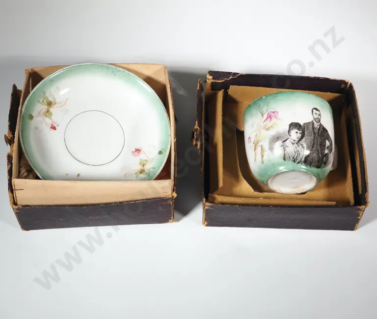 Boxed Victorian Cup & Saucer Depicting a Couple. Possibly A Souvenir