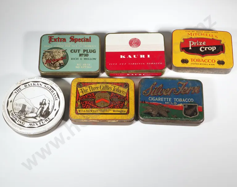 Bag Containing Six Cigarette Tins, Mitchell's Prize Crop,Silver Fern, Kauri, Three Castles, Extra Special Cut Plug No10