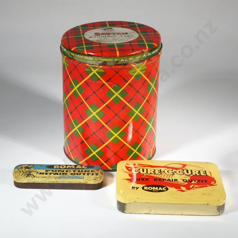 Bag Containing Five Vintage Tins Including Cure-C_Cure, Romac Repair Puncture, Crumpsall Works Gala Tin etc.