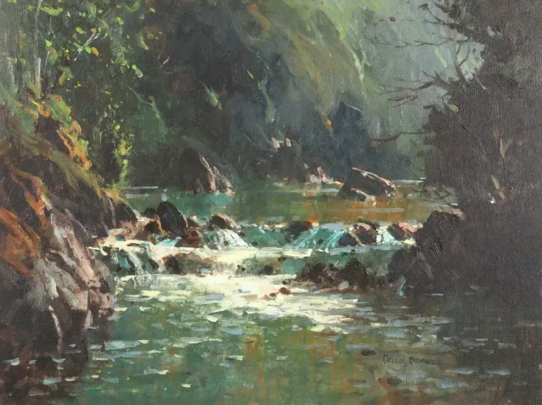 Peter Beadle. Percy Burn Stream, South Arm, Lake Manapouri. Oil on Board.