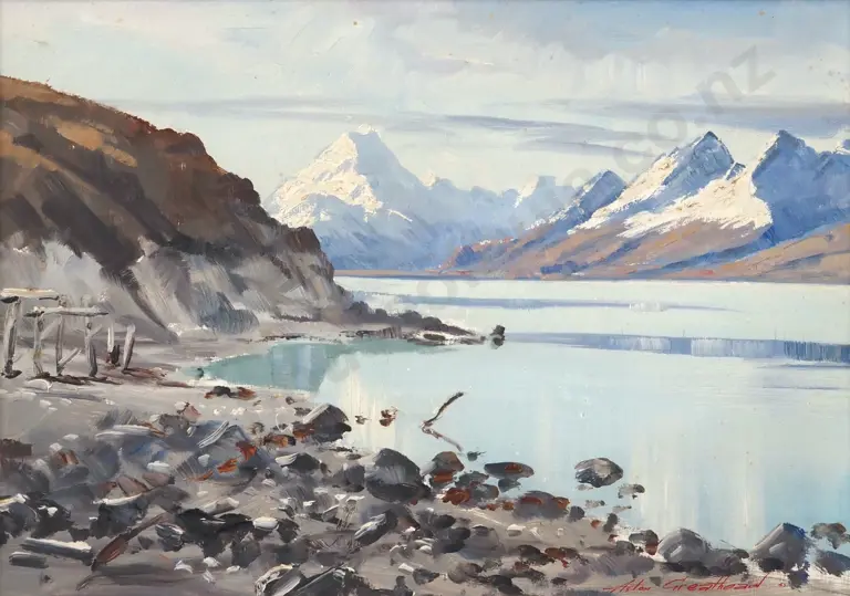 Aston Greathead "Mt Cook Lake Pukaki Level Very low Showing the piles of Bridge on First Cook Road" Oil on Board
