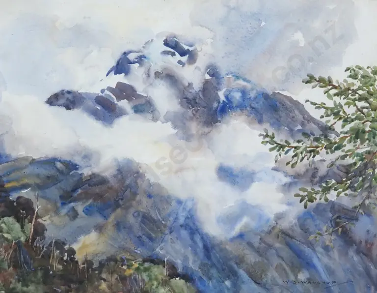 W.S. Wauchop. South Island Alpine Landscape w Rising Mists. Watercolour.