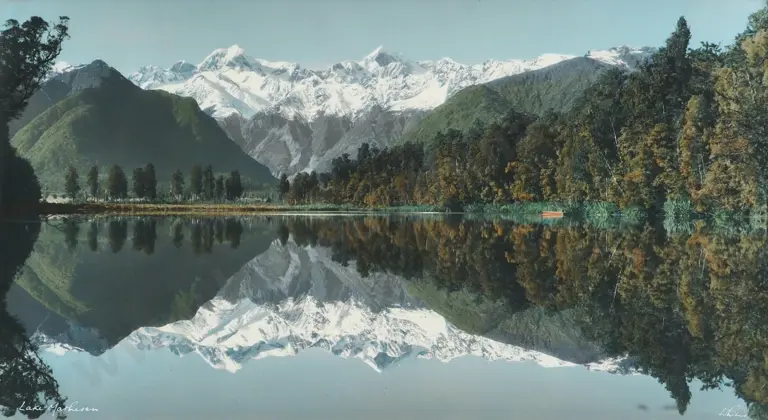 Whites Aviation. Lake Matheson. Hand Coloured Photograph.