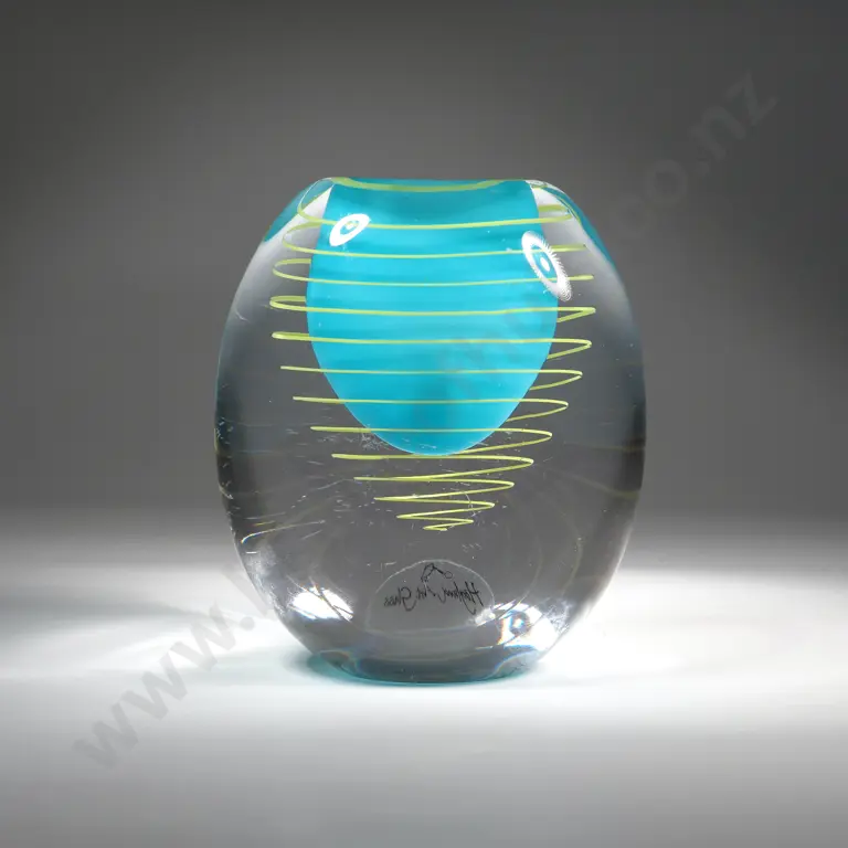 Hoglund Art Glass Vase - Clear Glass, w Submerged Turquoise Centre Surrounded by Yellow Spiral.