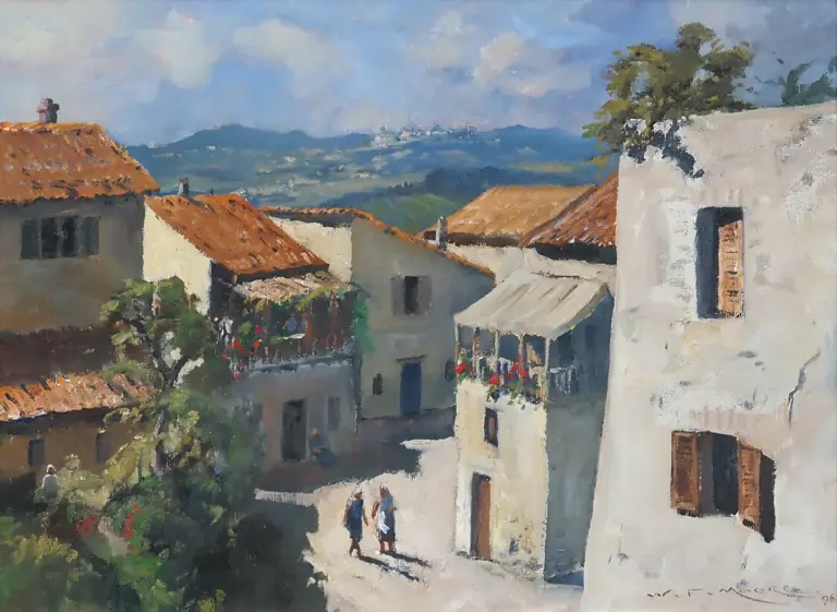 W F Moore, "Morning Conversation", Voltera, Tuscany. Oil On Board. Signed. 350 x 470mm