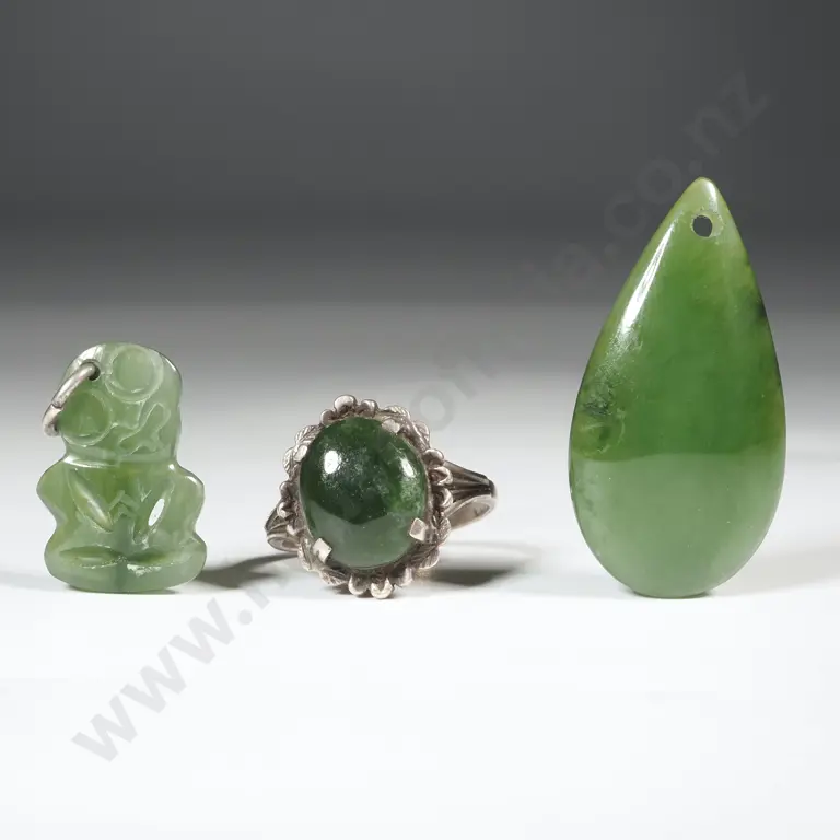 Sterling Silver & Greenstone Ring, Oval Greenstone Pendant & A Small Greenstone Tiki Estimate: $50 - $100