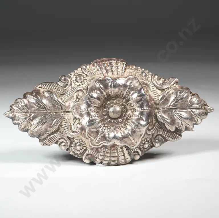 White Metal Brooch With Moulded Flower & Leaf Decoration