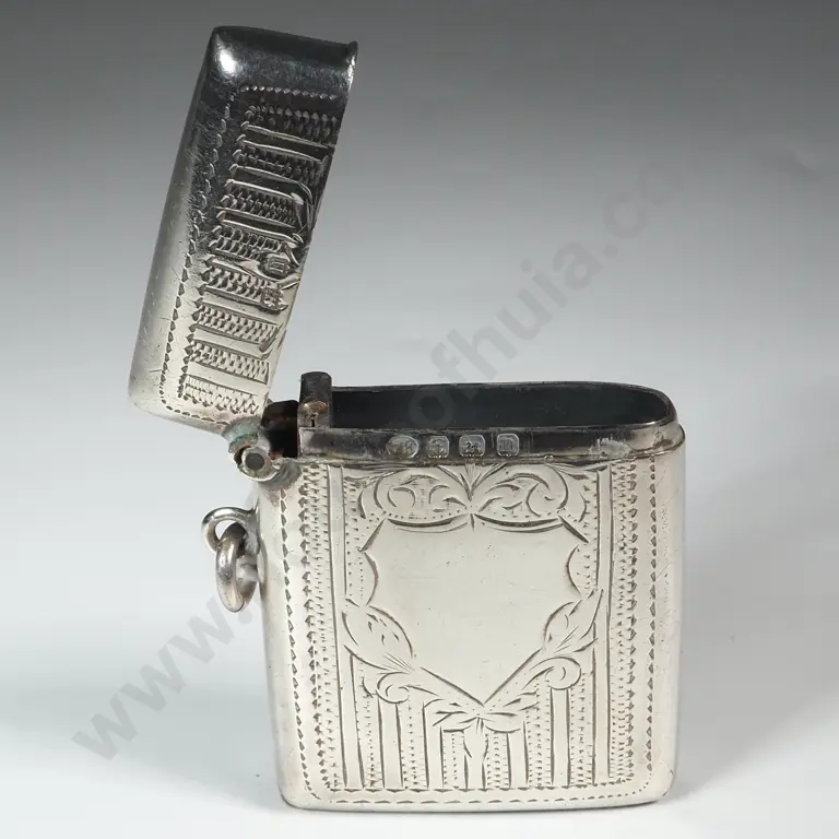 Sterling Silver Engraved Vesta Box With Shield Shaped Cartouche