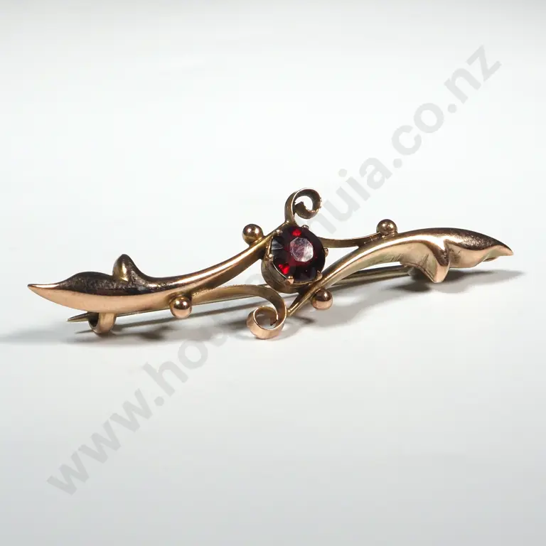 9ct Bar Brooch With Garnet Set In Scrolls