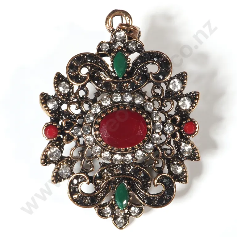 Indian Style Pendant Encrusted With Red, Green & White Stones Set In Copper Coloured Metal