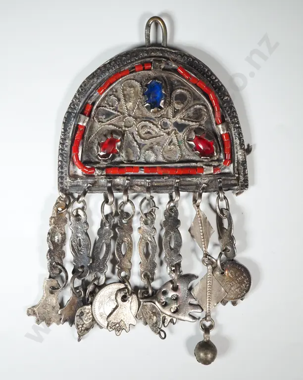 Vintage Sterling Silver Tunisian Pendant w Corals & Glass Paste. A/F
