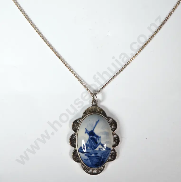 Sterling Silver Necklace w Delft Pendant.